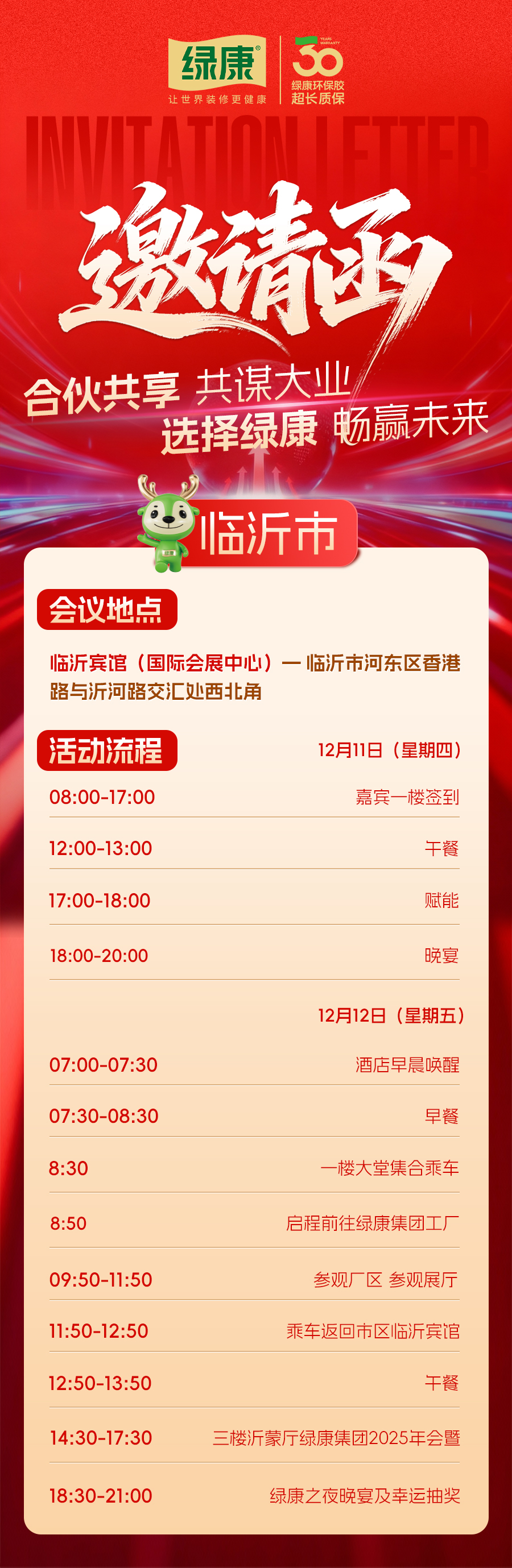 此刻,我們誠(chéng)摯地邀請(qǐng)您,于2025年12月12日,蒞臨山東臨沂綠康生產(chǎn)基地,參加 “合伙共享 共謀大業(yè)——選擇綠康 暢贏未來” 主題盛會(huì)。